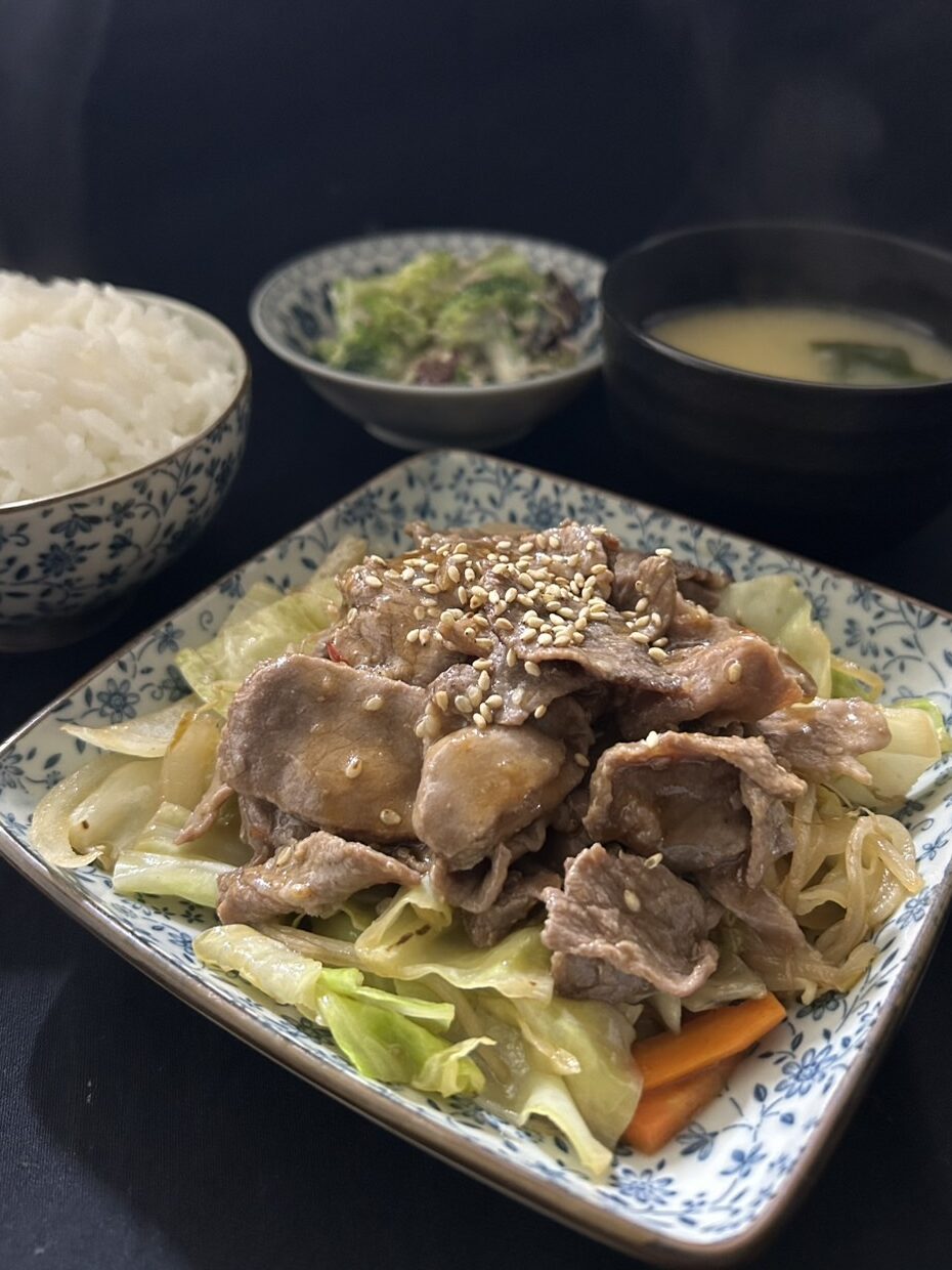 肉野菜炒め・ブロッコリーのツナマヨ和え・味噌汁です。