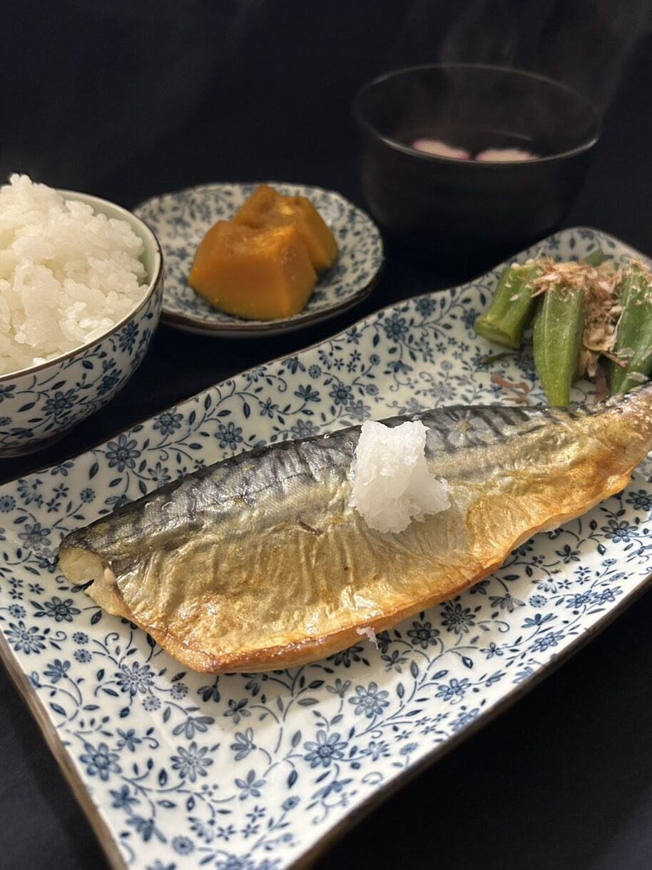 11.7 サバの塩焼き・かぼちゃの煮物・オクラのお浸し・お吸い物です。